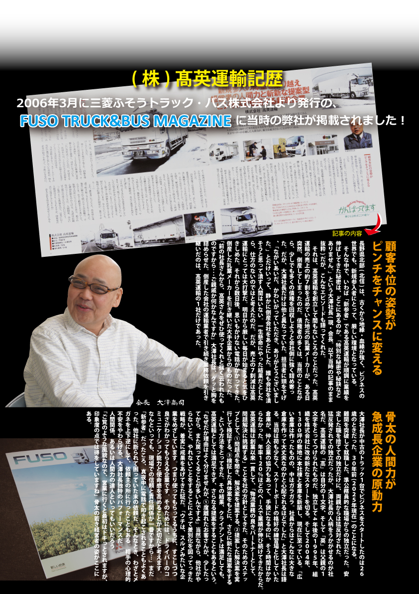 創業よりお客様の問題解決を主題に、知恵を絞り、理想的な物流システムの実現に努める、そして、感謝されるサービスを提供し続ける。それはこれからも何一つ変わること無い事を改めて皆様にお伝えさせていただきます。